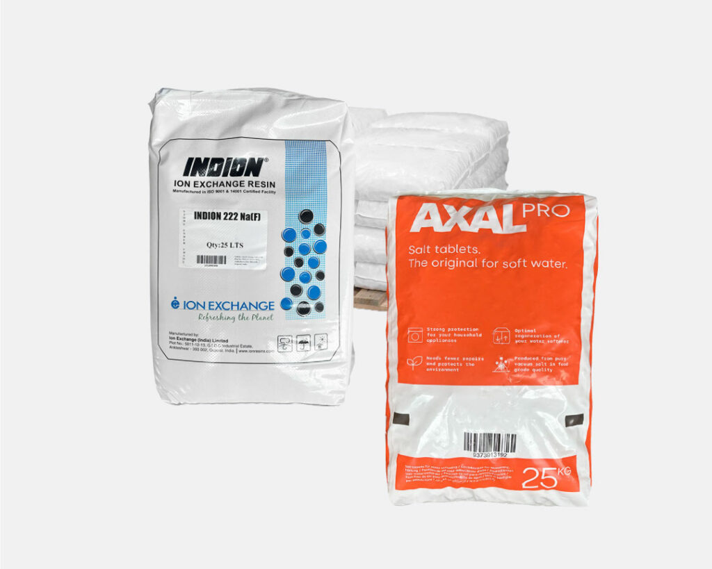 Sels en pastilles pour adoucisseur d’eau et résine disponibles en palettes.